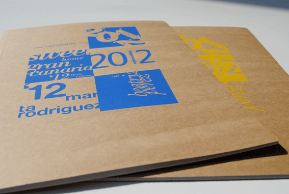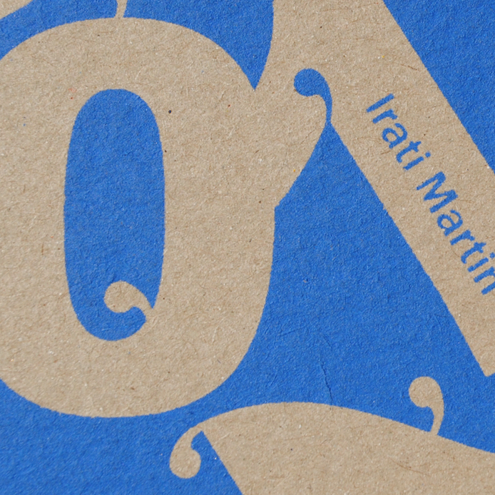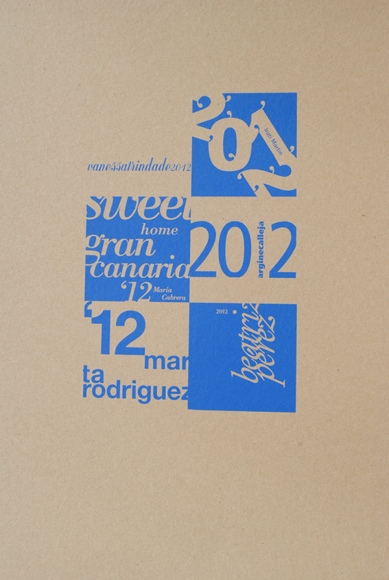 Partiendo de esta idea que le agradezco, y aprovechando la coyuntura de que hemos tenido muy pocos alumnos, propuse un ejercicio corto de composición con sólo dos componentes: el nombre de cada alumno y el año académico. Cada estudiante me entregó un cuadrado de 70 x 70 mm en positivo y negativo. Este mes he organizado un mosaico con estas piezas y he impreso una serie en serigrafía. Podéis ver el cartel, carpetas y los módulos cortados.