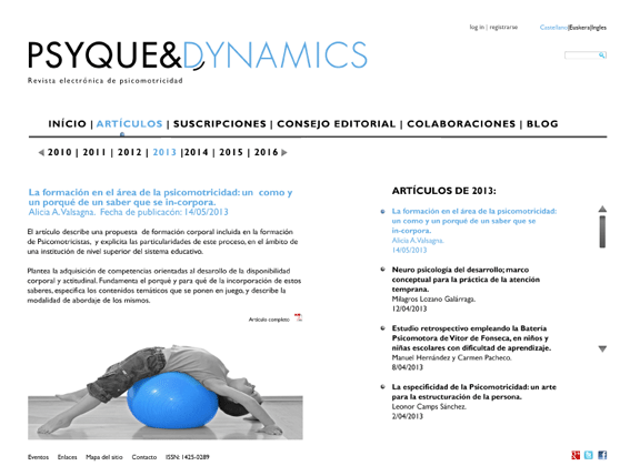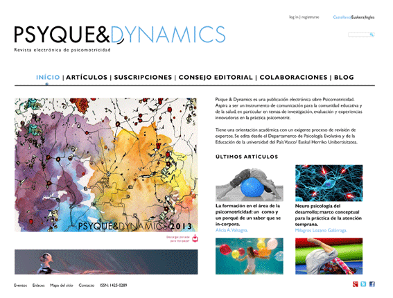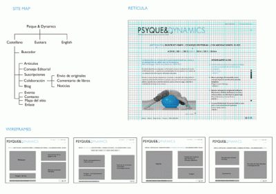 El cuatrimestre pasado, en la nueva asignatura de Diseño Gráfico para la interactividad, propuse a mis estudiantes el diseño de la interfaz gráfica de una revista electrónica de Psicomotricidad, sobre investigación en este área. Su nombre, Psyque & Dynamics, hace referencia a la interacción de la mente y el movimiento del cuerpo. Aunque los alumnos saben que estos proyectos se desarrollan entre varios profesionales, el ejercicio les ha servido para adquirir nociones básicas de arquitectura de la información y para tener una primera experiencia en el diseño para la pantalla.