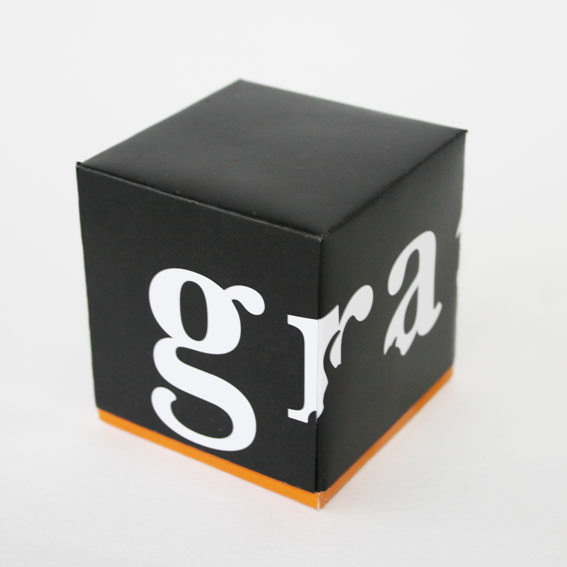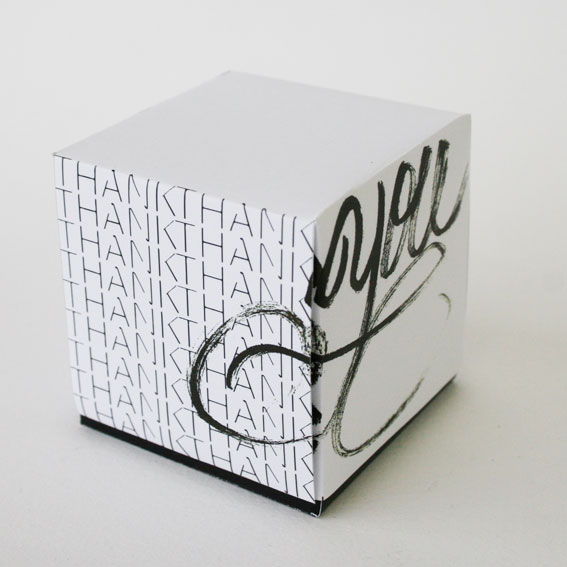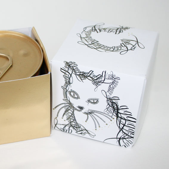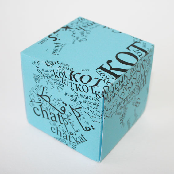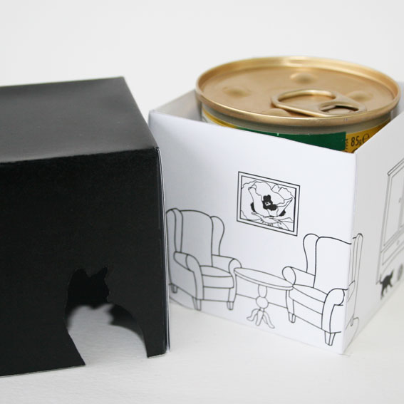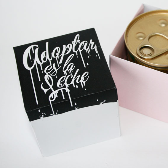 Gatografías es un proyecto para la asociación protectora de animales, Felinos Bilbao. Es el segundo año que propongo a mis alumnos este ejercicio. Esta caja en forma de cubo tiene dos latas de comida dentro. Es un detalle; un regalo para entregar a las personas, junto con el animal que acogen en su casa. Este año lo he enfocado mejor. El mensaje de este contenedor tenía que ser de agradecimiento o para valorar y elogiar la acción de adoptar el gato. La propia caja también podía ser concebida como objeto lúdico para el animal.