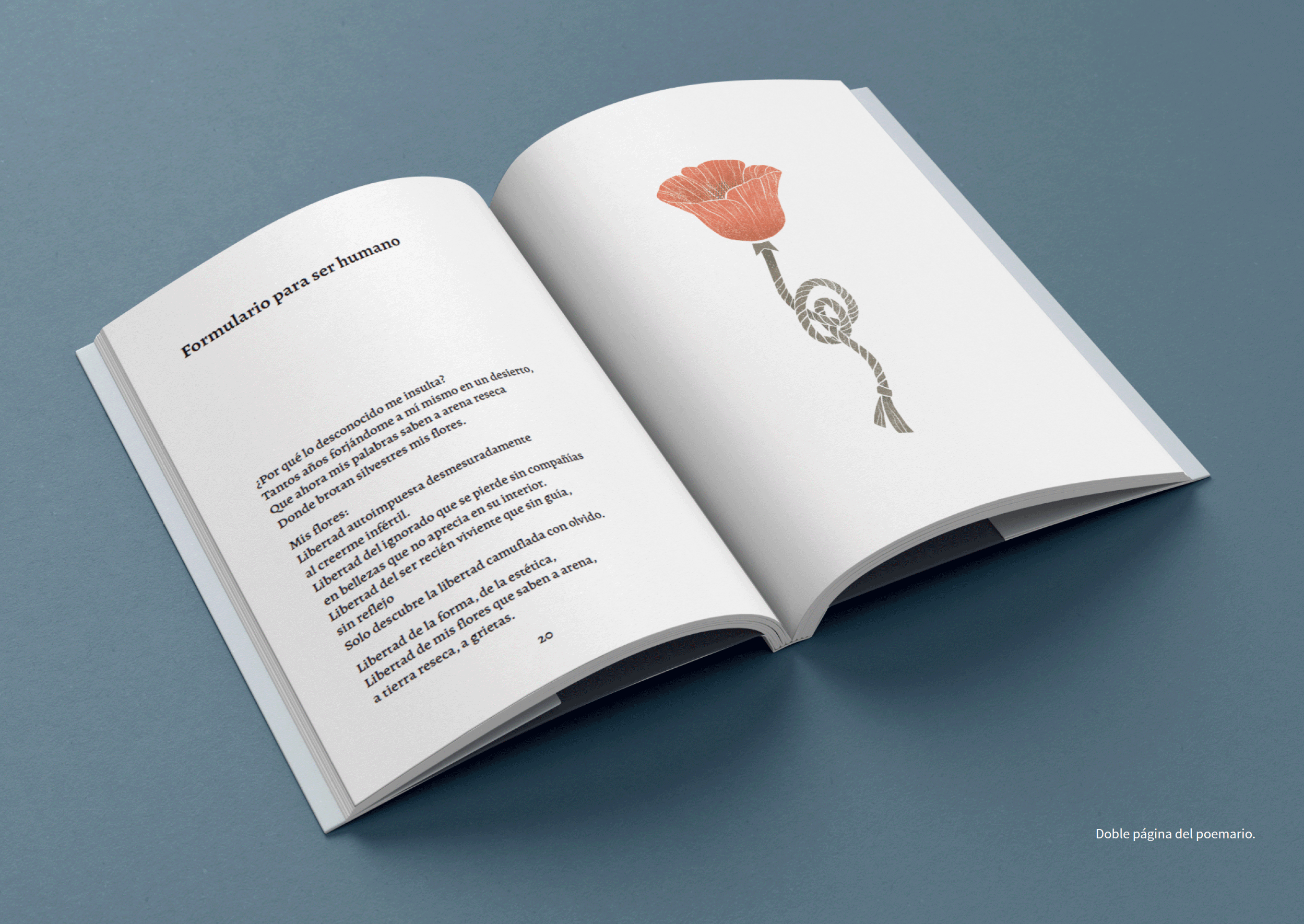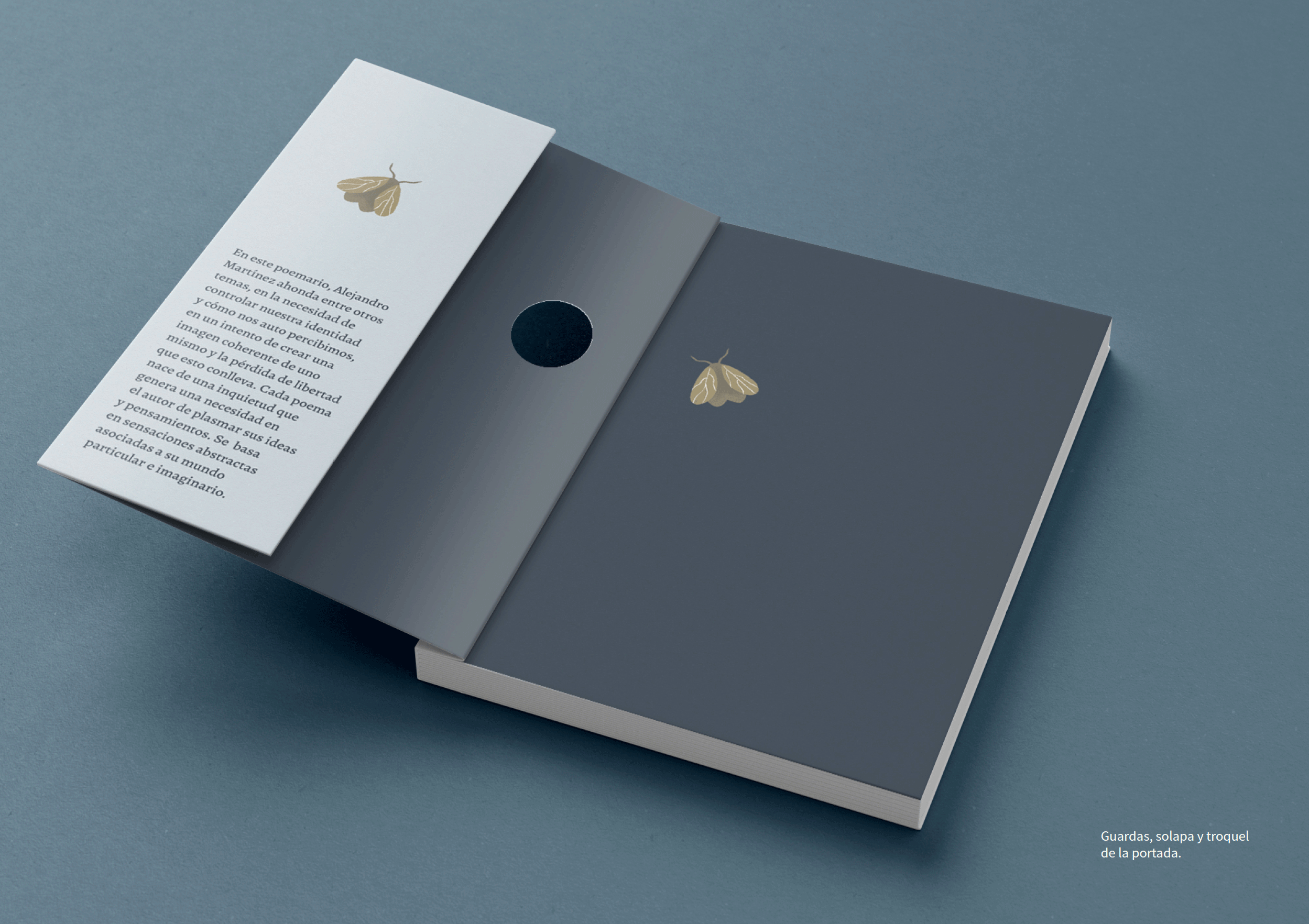 Presenta una propuesta definitiva con una retícula diseñada específicamente para las necesidades de la publicación. Cada verso se asienta en su línea de base, pero divide el interlineado en cuatro para poder crear espacios de párrafo proporcionales y armonizar el conjunto. También elige el ancho de columna dependiendo del ancho máximo de los versos de cada poema, para equilibrarlo en la página en la medida de lo posible. El proyecto muestra una diagramación clara y flexible, con un ritmo de lectura adecuado en cada página y entre cada doble página. En la cubierta, un círculo troquelado invita al lector a volver la página y adentrarse en el contenido. El tono y la gama cromática de las ilustraciones también le acompaña, apoyando las connotaciones que se desean transmitir en el poemario, con analogías gráficas que son sus propias interpretaciones; otros poemas, pero visuales.