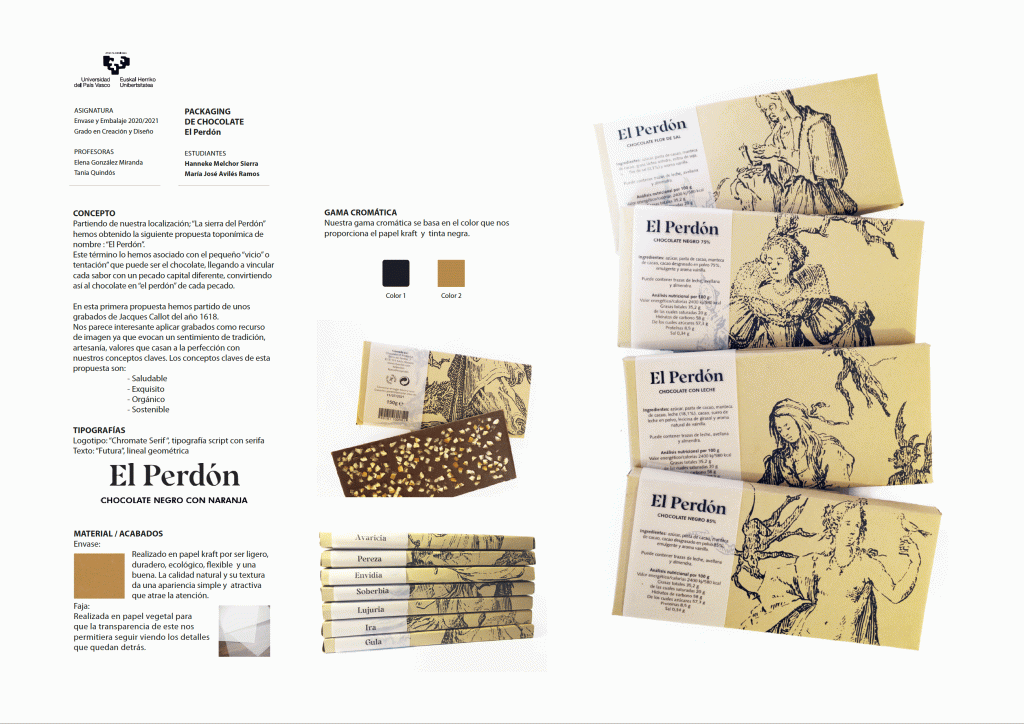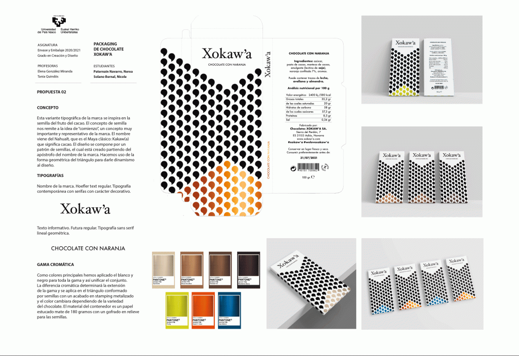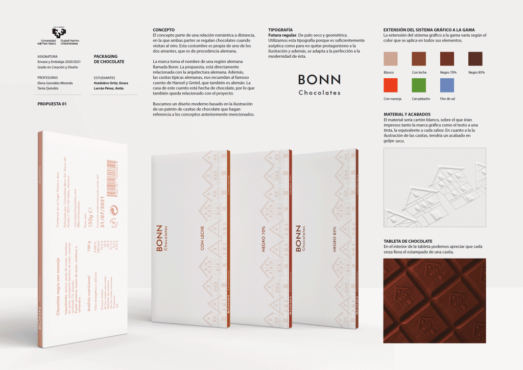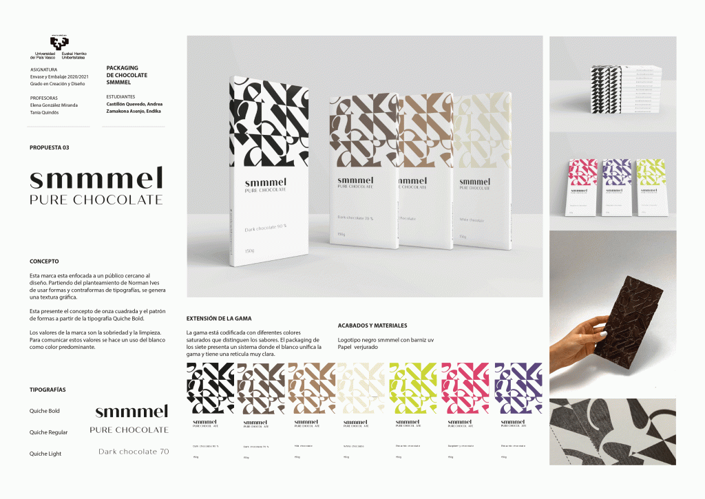 Tras tres años proponiendo un trabajo sobre etiquetas de vino en la asignatura de Envase y embalaje (Packaging), este último año académico 2020-2021, hemos comenzado con el sector del chocolate. Planteamos el diseño del envase/embalaje para una gama de productos de chocolate de diferentes sabores, incluido el diseño de la tableta. Estos son algunos resultados. En el último proyecto podemos observar que Andrea Castillón y Endika Zamakona, han realizado incluso el molde y la tableta comestible (que en este sector, es un elemento importantísimo de identidad del sistema). Un placer haber aprendido tanto con este grupo, a pesar de la pandemia.