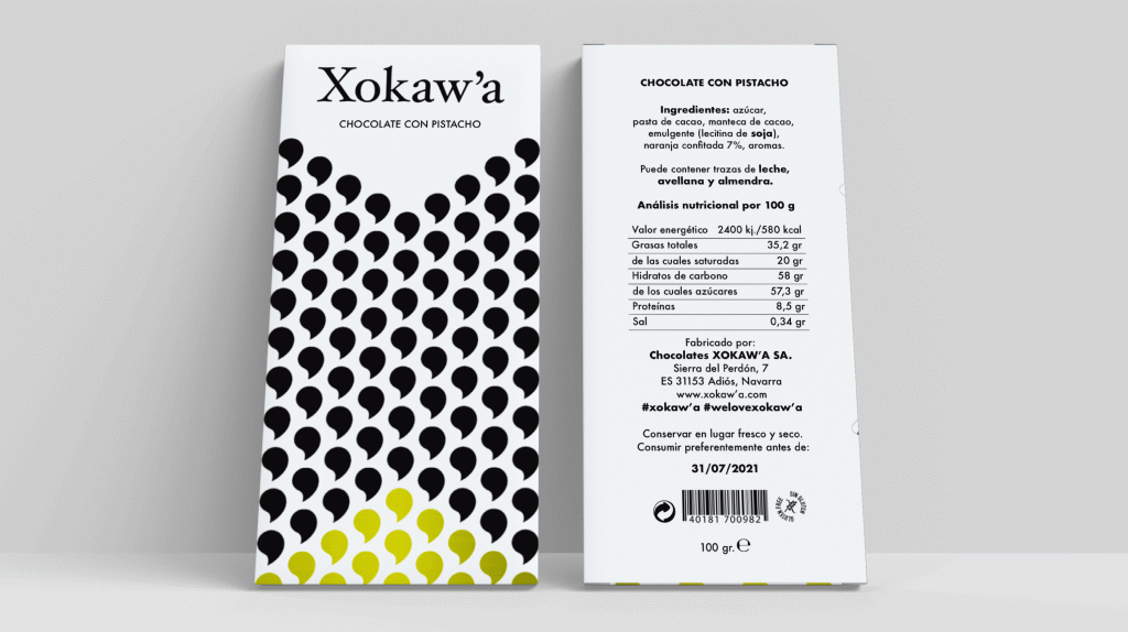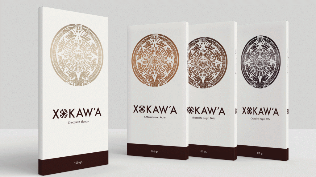 Puedes proponer dos enfoques, uno tipográfico (salvo símbolos obligatorios) y otro con un enfoque iconográfico como una ilustración, patterns o patrones, iconos o cualquier concepto que se considere adecuado para que el producto sea reconocido por el consumidor del chocolate, con signos distintivos que definan los valores y el carácter de la marca.